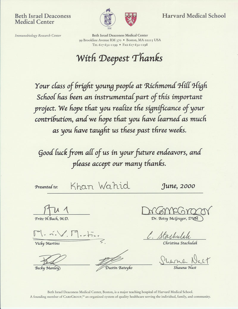 June 2000 - Harvard Certificate of Xenotransplant Project Participation